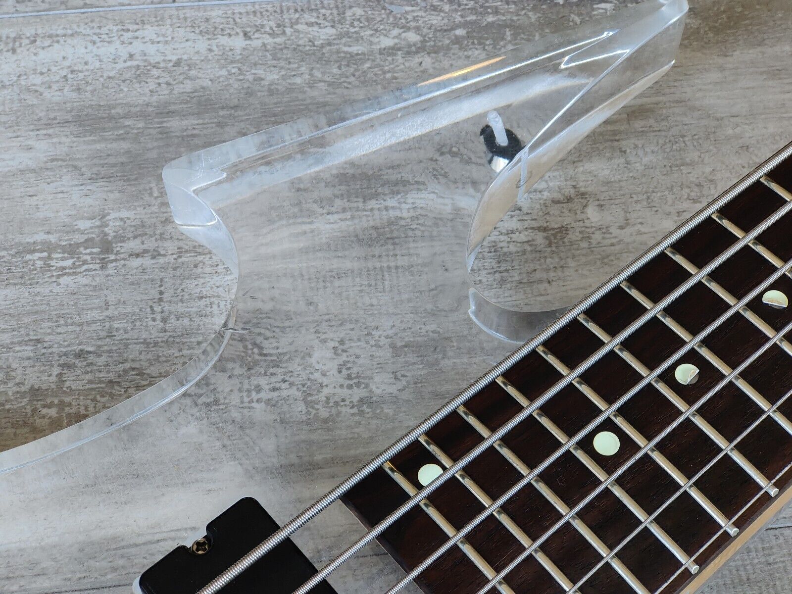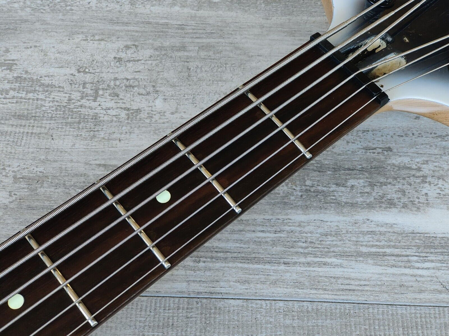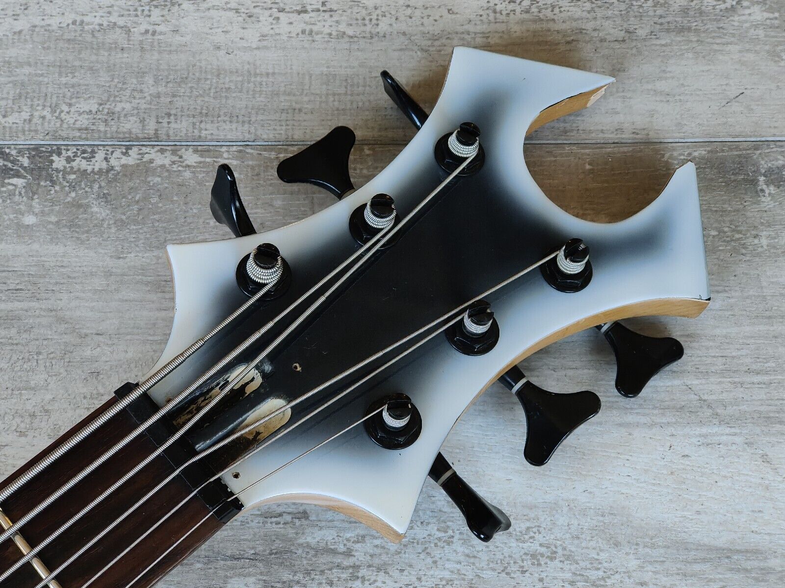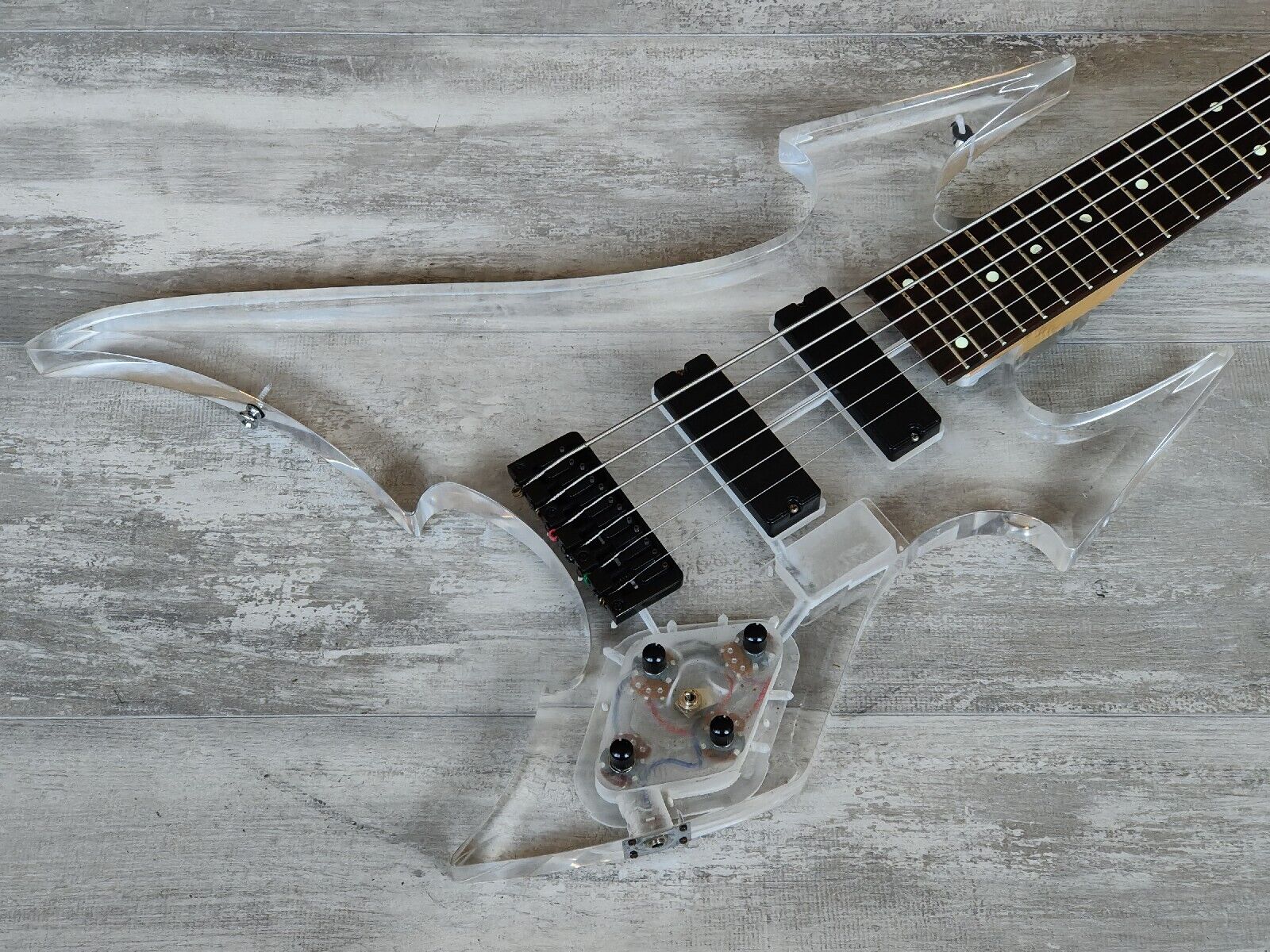 Six strings, two truss rods, seven kilograms, 24 frets, this thing is insane. 55mm nut width on a maple neck and rosewood fingerboard, loaded with a pair of passive pickups controlled by a mini three-way toggle and volume/tone knobs for each.