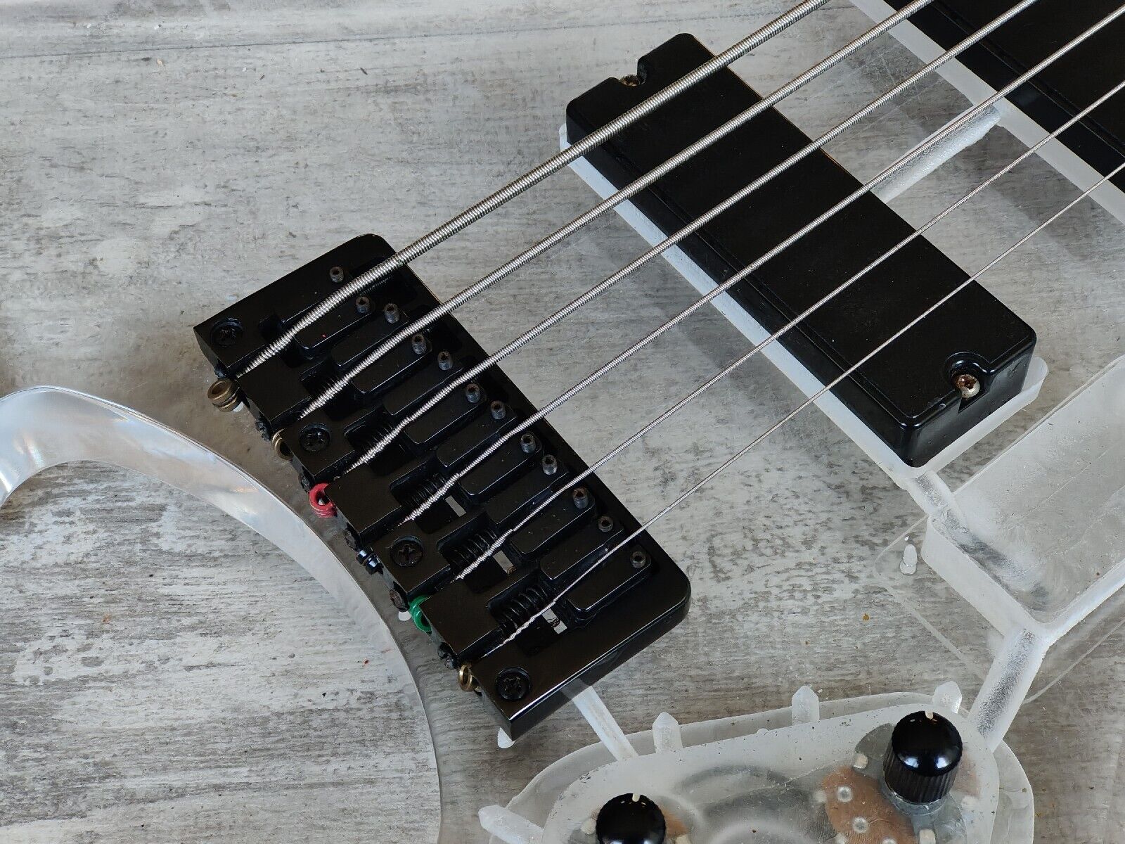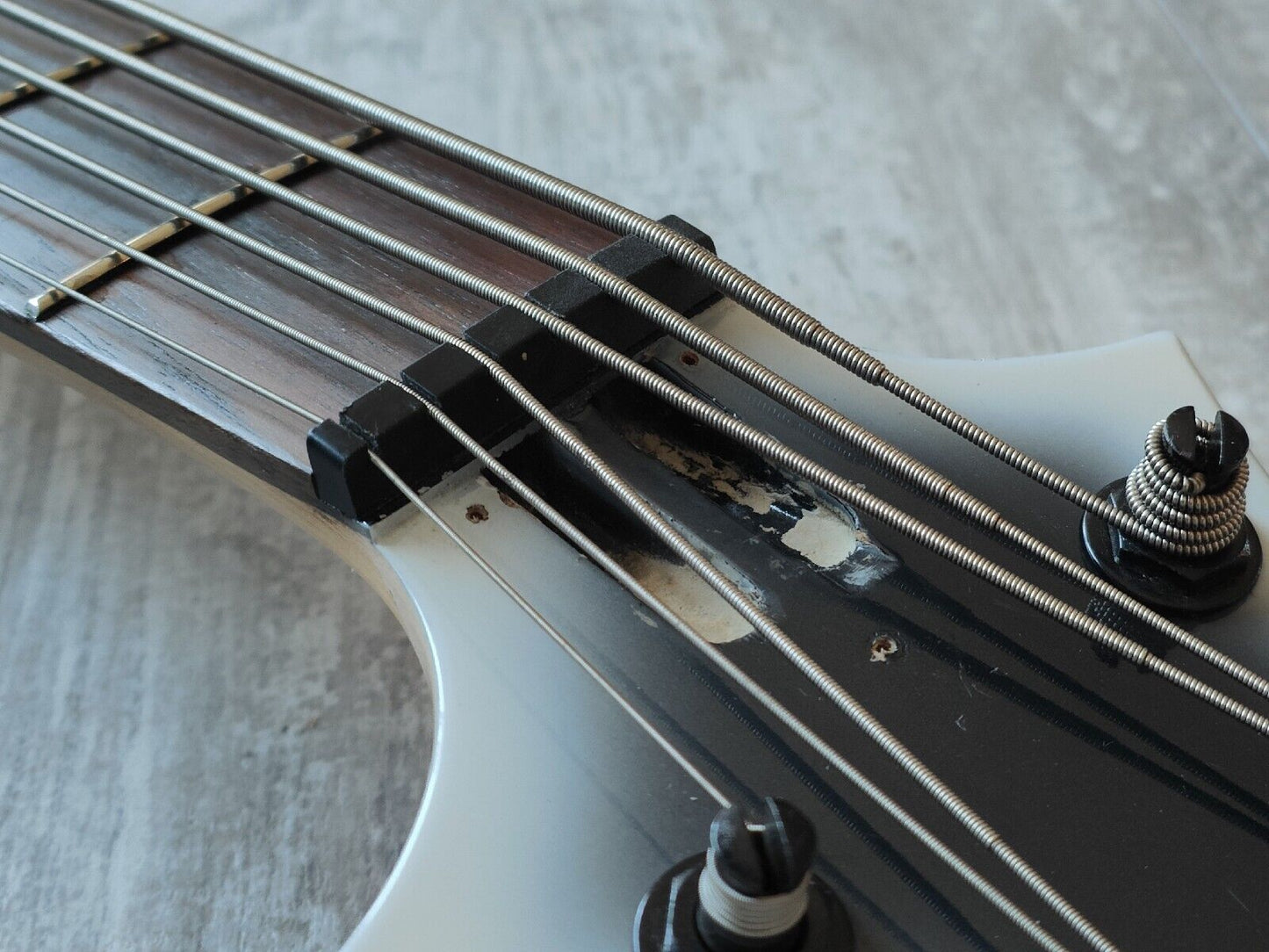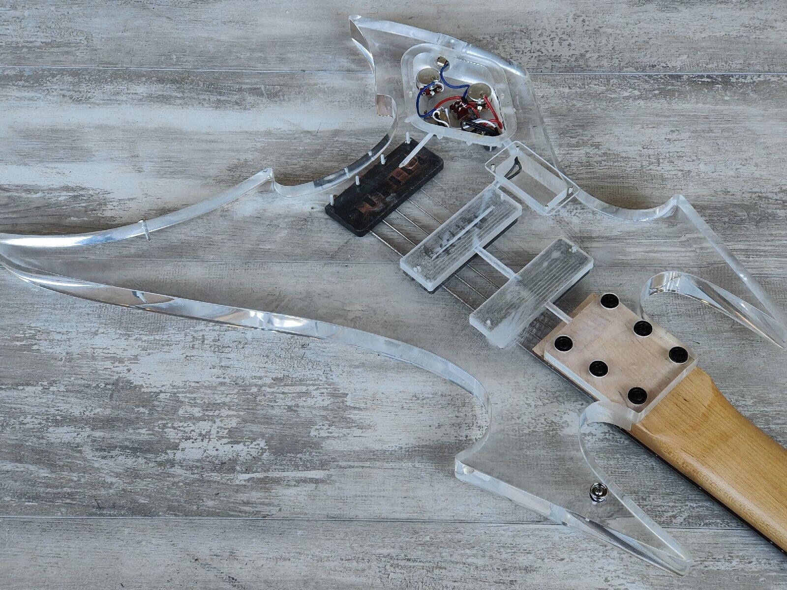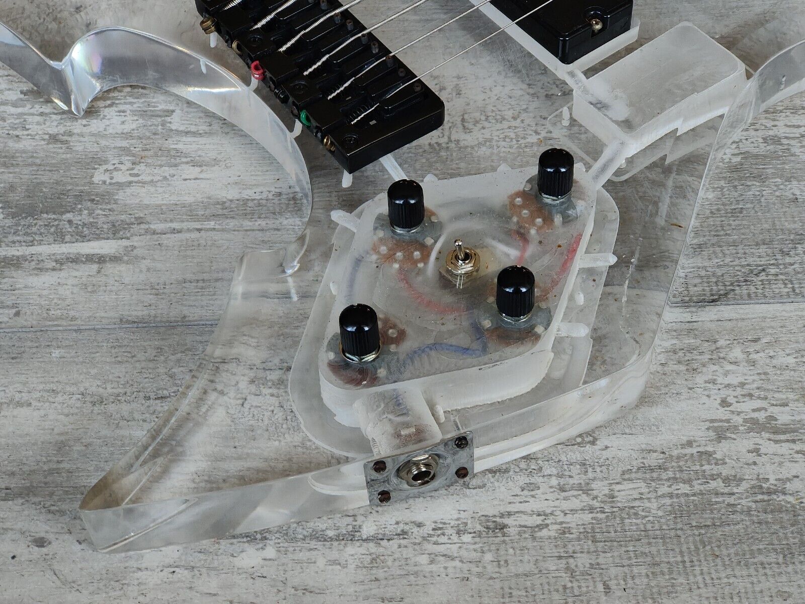Six strings, two truss rods, seven kilograms, 24 frets, this thing is insane. 55mm nut width on a maple neck and rosewood fingerboard, loaded with a pair of passive pickups controlled by a mini three-way toggle and volume/tone knobs for each.