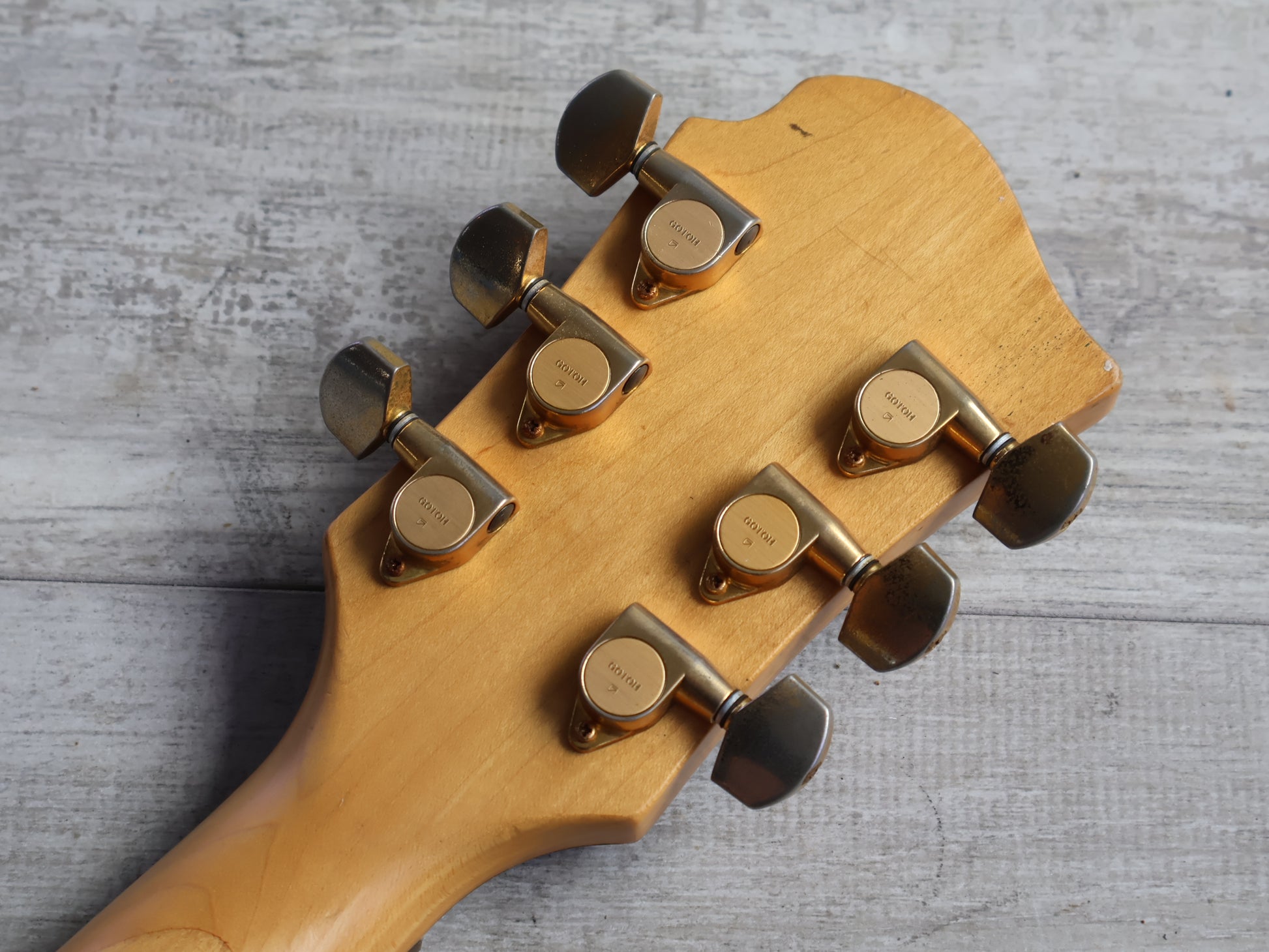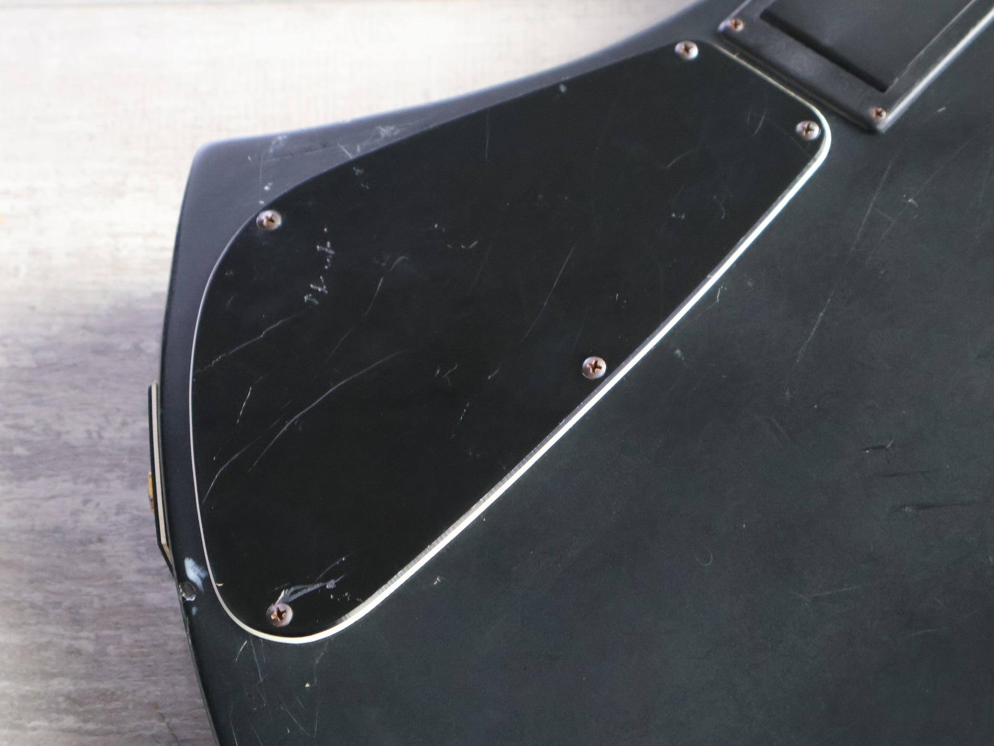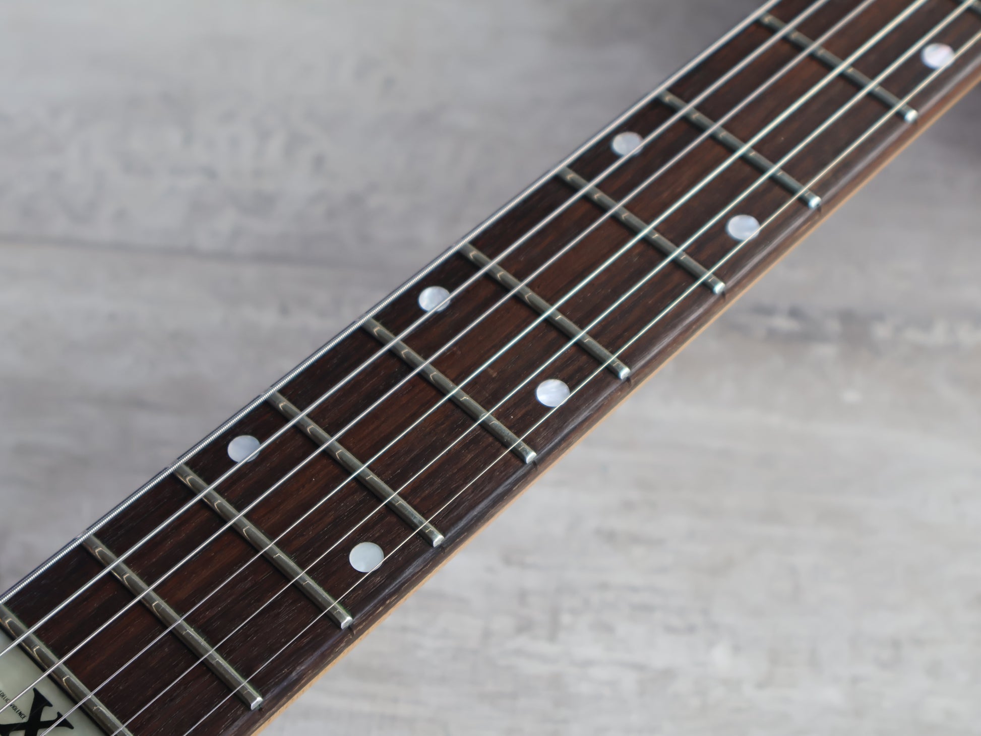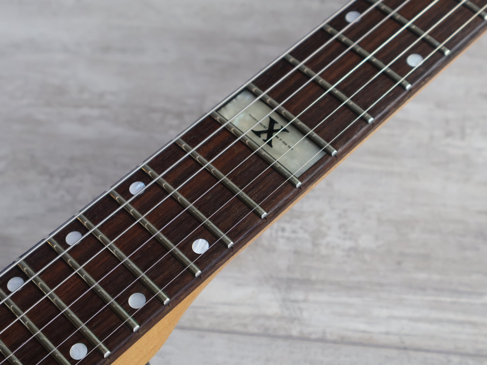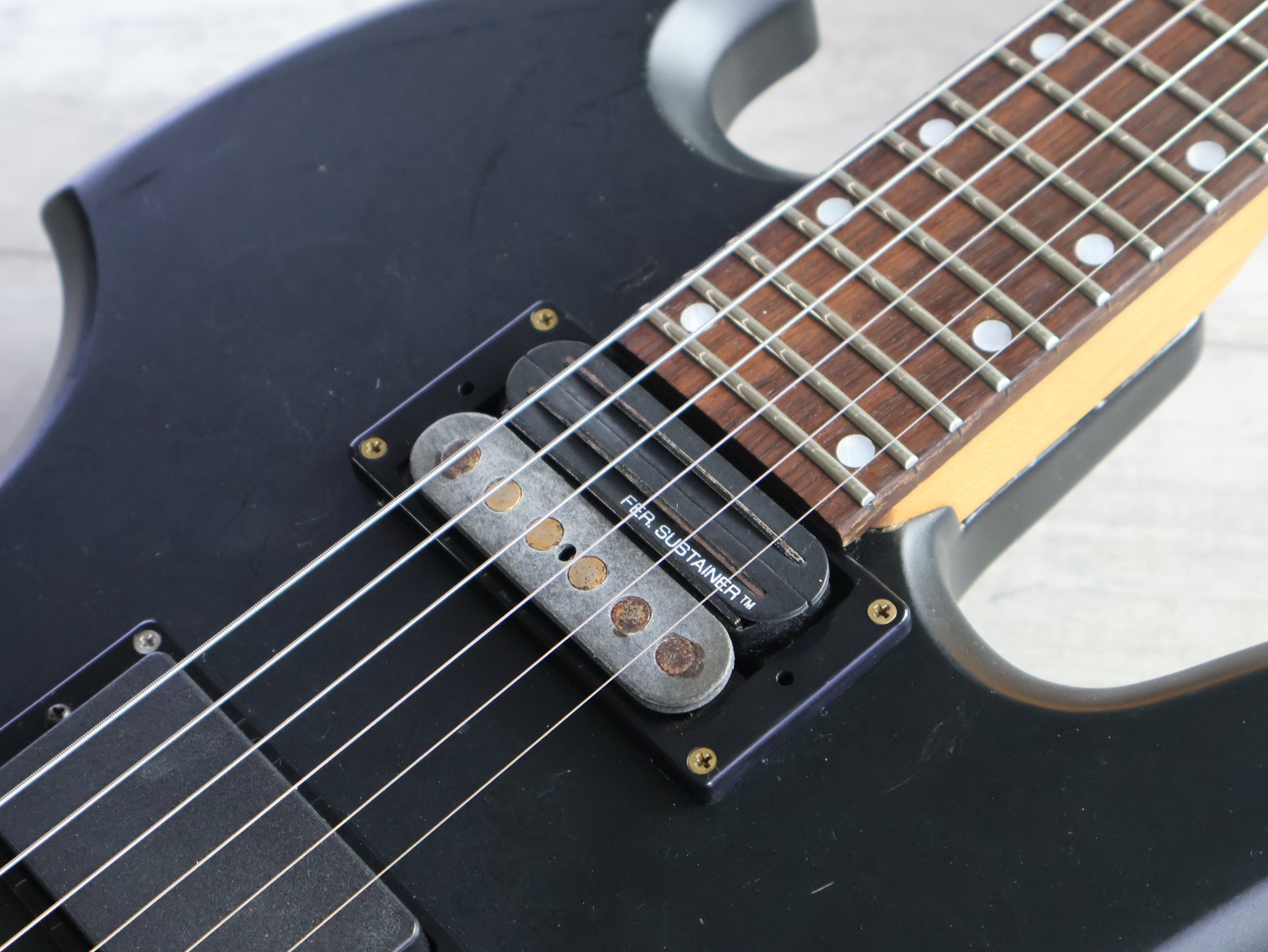 Made in Japan in the early 1990's as a signature model for Hide of X Japan. Slim mahogany body with a bolt on maple neck and a 24 fret rosewood fingerboard (13.75" radius, 24.5" scale length), it weighs 3.8kg's. Loaded with an upgraded EMG 81 in the bridge position with the original Sustainer in the neck position controlled by a master volume knob along with a 3-way pickup selector, sustainer on/off switch and sustain harmonic switch.