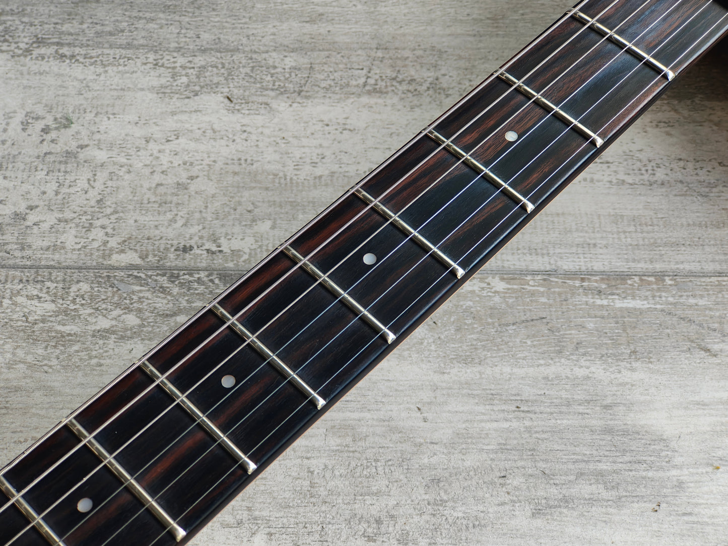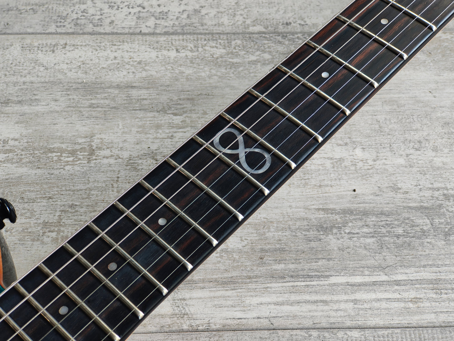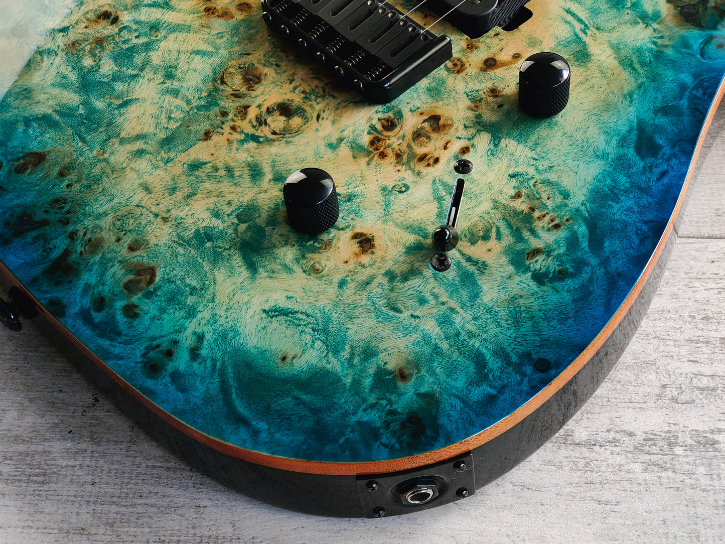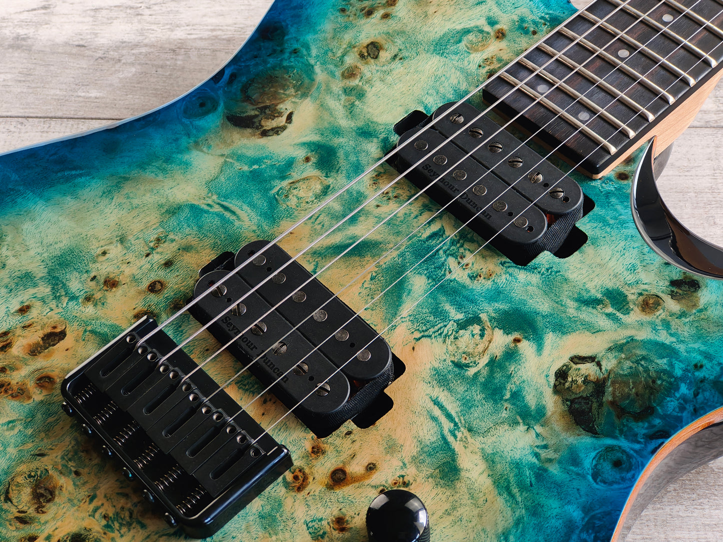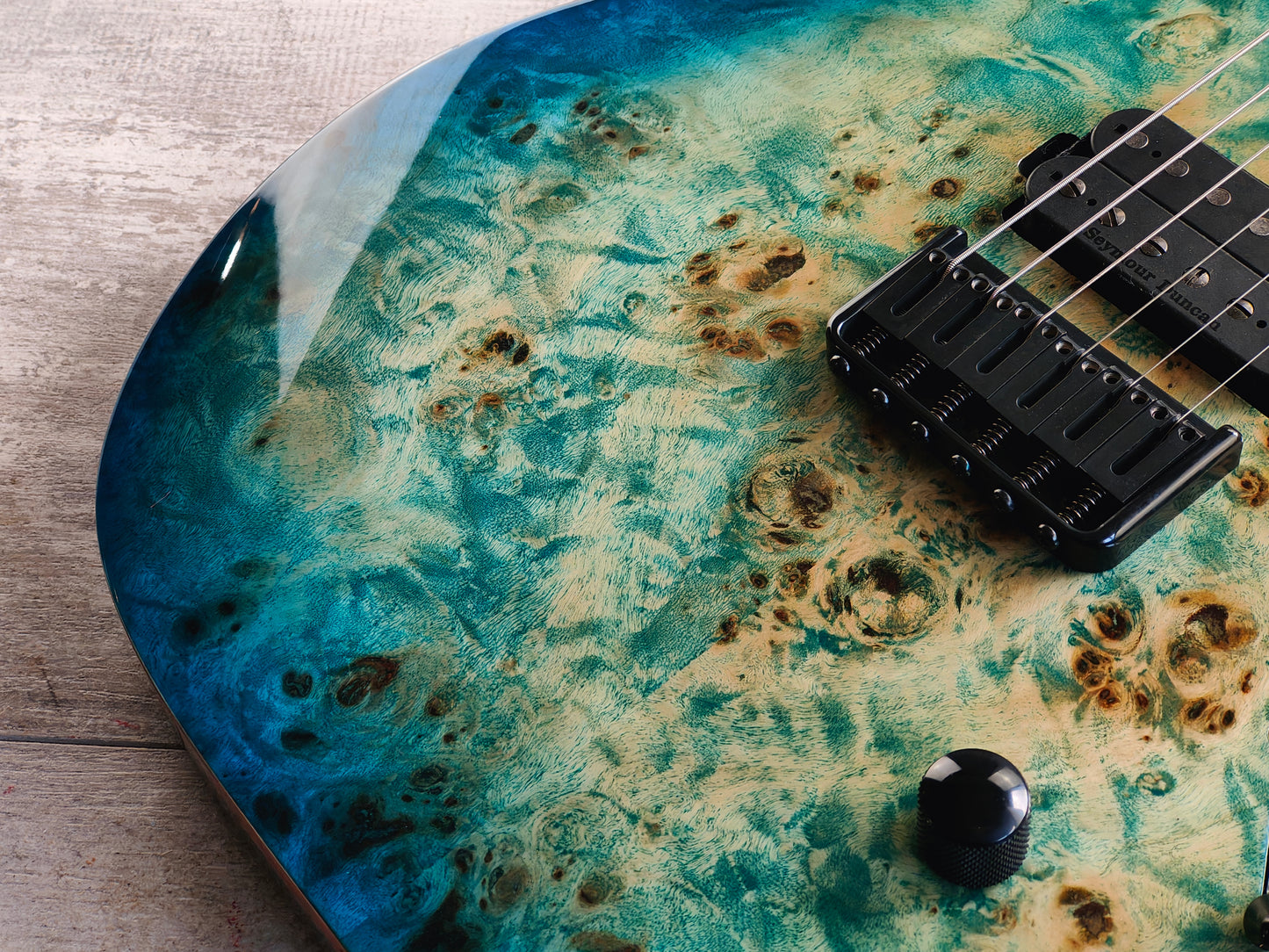 A modern recessed bolt-on neck construction with ergonomic cutaways, combined with a Maple neck and Macassar Ebony fingerboard are perfectly designed for hours of comfortable and tasty shredding. A Poplar Burl top with a Rainstorm finish makes for one head-turning guitar, as well as adding just enough brightness to the warmth of the Mahogany body.