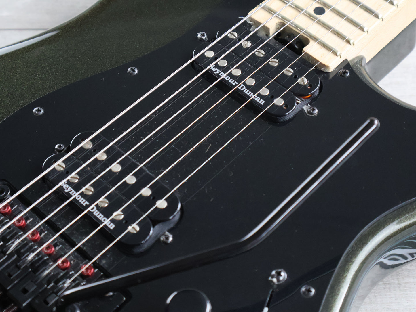 Hot-rodded for unparalleled performance, versatile sound and outstanding playing feel, this instrument hosts a high-output Seymour Duncan® TB-6 Distortion™ humbucking bridge pickup and a warm, fat Seymour Duncan® SH-6N Distortion™ humbucking neck pickup for killer tone all night long. The volume control hides a push/pull coil split for even more highly useful tonal variations, ideal for everything from a biting lead sound to thick, chunky rhythm work. Scream or rumble with the Floyd Rose® FRT-O2000 double-locking recessed tremolo and FRT-O2000 locking nut without sacrificing tuning stability or the pinpoint intonation. The rock-solid two-piece maple neck carries a thumbwheel butt-adjust truss rod along with a pair of graphite reinforcement rods to match your personal specifications while remaining as true as your commitment to playing, despite the ravages of the road and climate. Engineered for effortlessly nimble playing, the speed neck profile and 12”-16” compound radius maple fingerboard are perfect for all styles of play from low end riffing to soaring leads with worry-free upper-register bends.