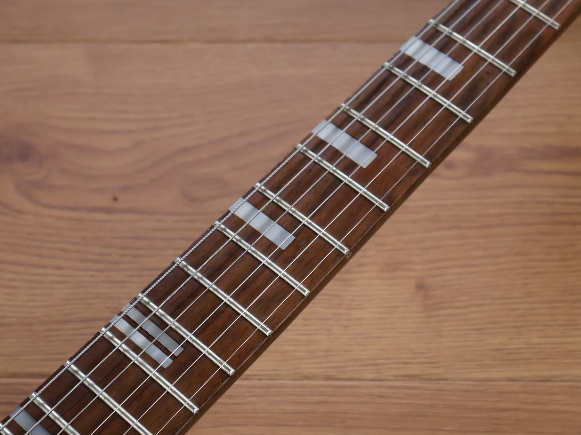 The Elite Custom features a thin mahogany body with pearloid top, and a 22-fret, 24" scale, set-in slim profile mahogany neck with rosewood fingerboard and piano key inlay. Includes a TonePros tune-o-matic bridge with stopbar, Daisy Rock High Output Humbuckers, master volume, master tone-tap and 3-way selector. Equipped with D'Addario EXL 110 strings and Grover tuners. Available in Groovy Swirl and Blue Kaleidoscope finishes.