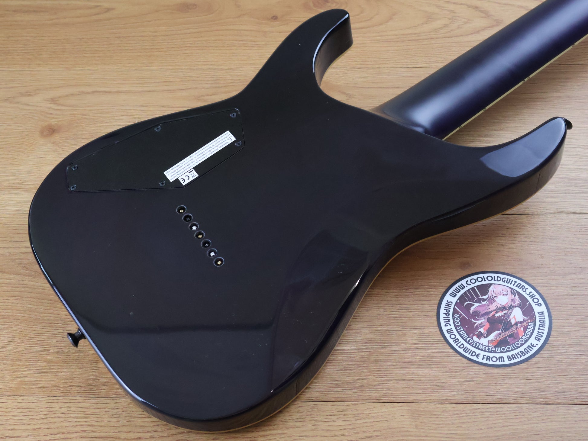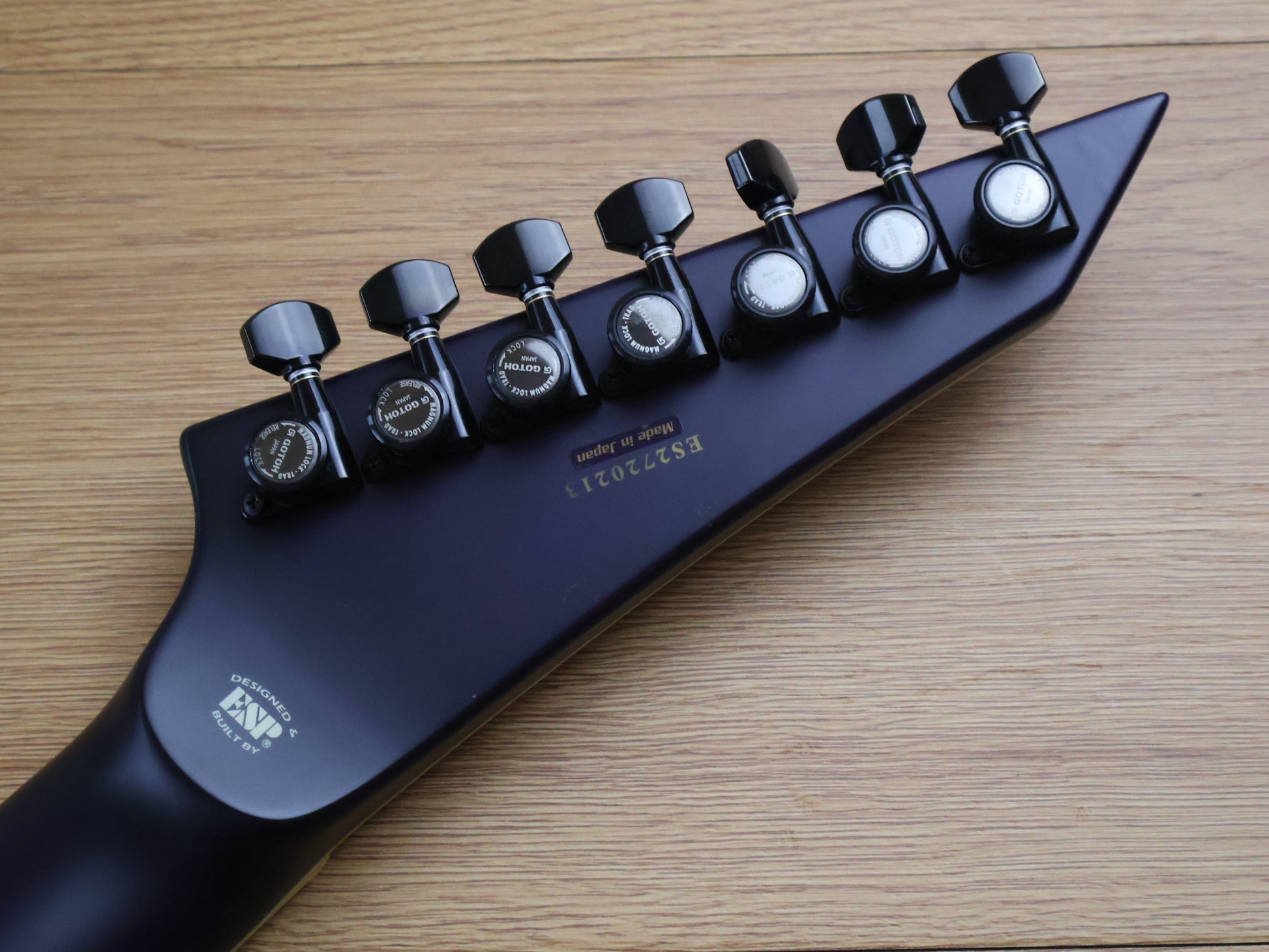 Hipshot hardtail, string‑thru bridge; ESP strap locks; Gotoh locking tuners