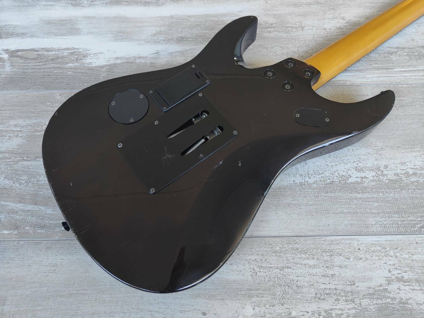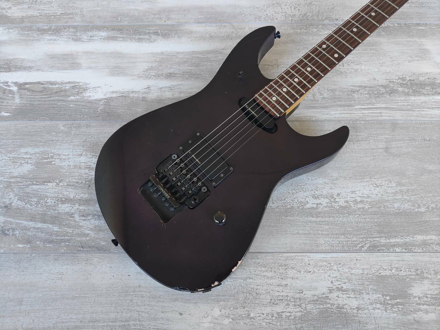 Made in Japan, the M-85C was an artist model designed with Ichiro Takigawa (CIPHER). Hard-to-photograph purple finish on the mahogany body with a thick maple top, slim maple neck and a 22 fret rosewood fingerboard (648mm scale length), weighs 3.7kg's. Loaded with active FGI active pickups and a FRT locking tremolo system.
