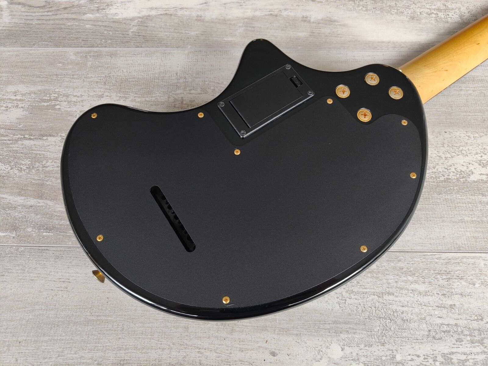 Black finish with a matching headstock, given a full setup and service prior to listing. Uncommon model with a single coil sized rail humbucker.