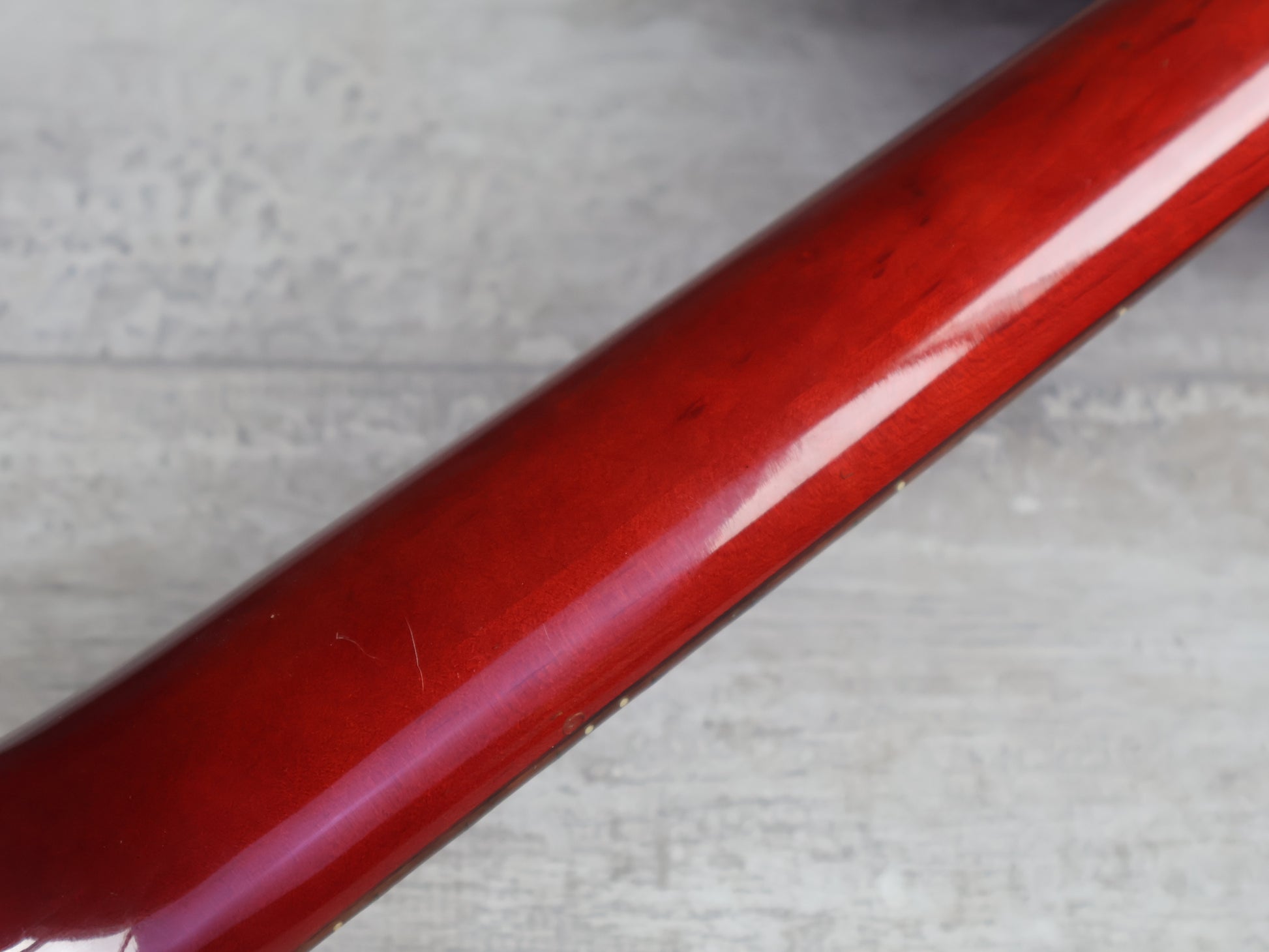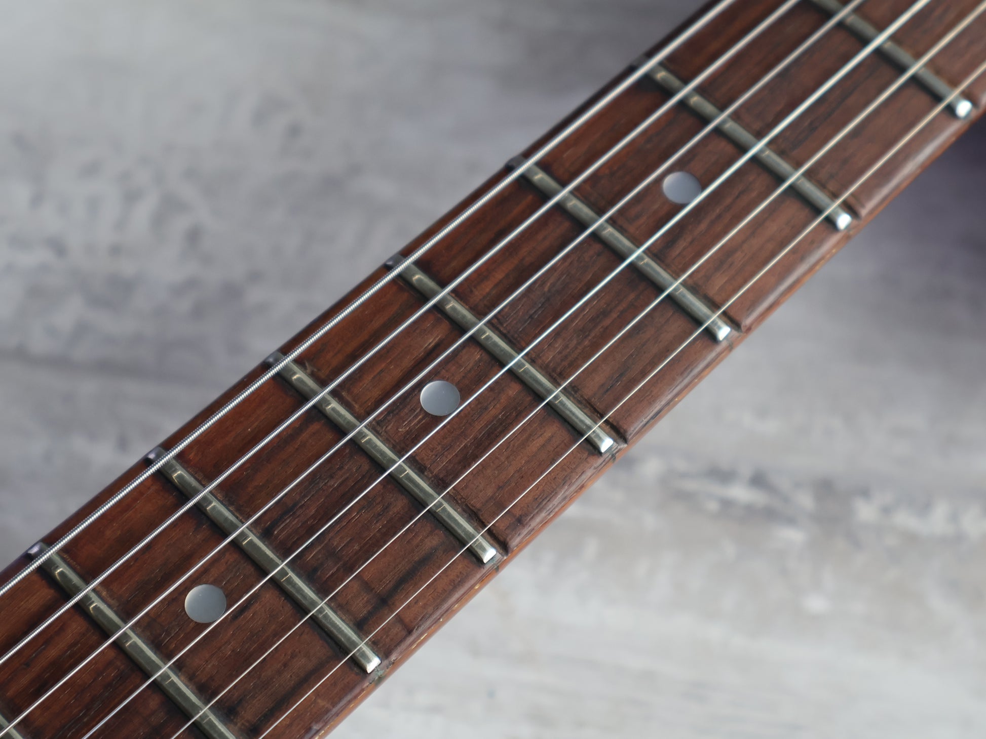 Loaded with a pair of aftermarket Tokai humbuckers with the original Greco tuners and hardware. Clean overall condition with some bonus holes from moving the strap button but no breaks or repairs. The neck is straight and the truss works as it should, the frets have some wear as expected but are shiny with plenty of life left.