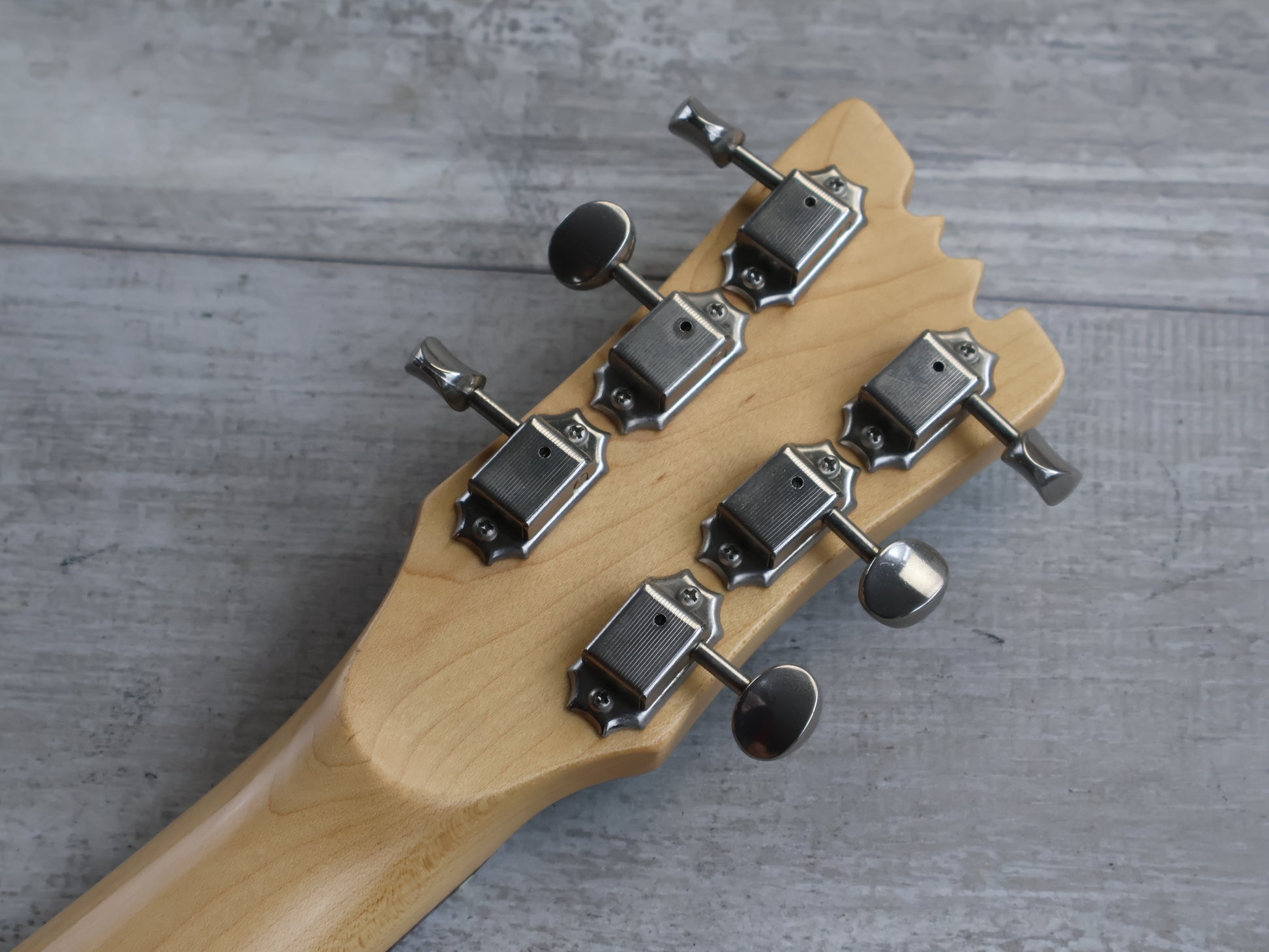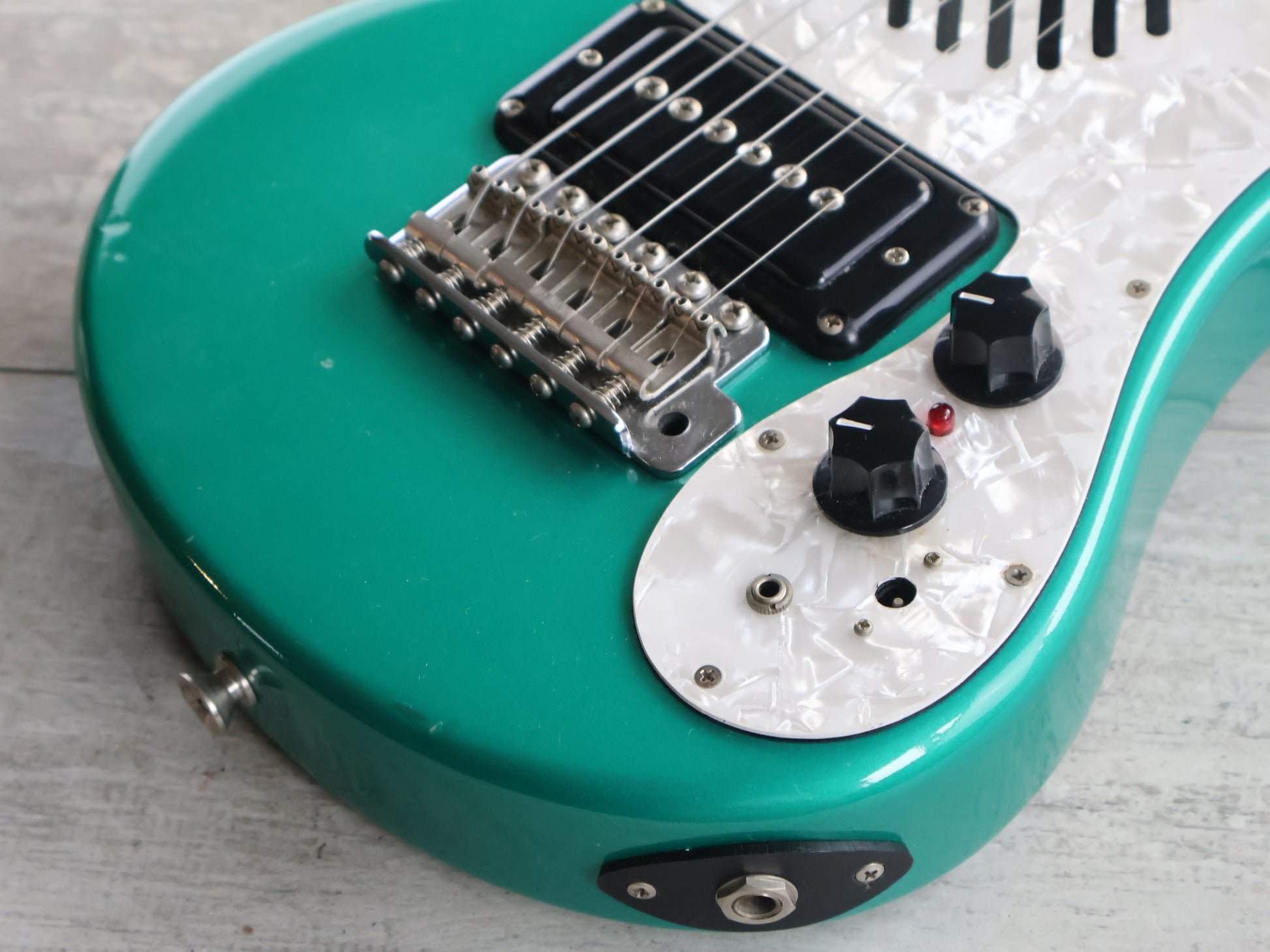 Made in Japan in what i believe is the 1990's, the Marine Rider was a Mosrite style travel guitar with a built in speaker. Compact maple body with a smooth maple neck with a 22 fret rosewood fingerboard, 628mm scale length (880mm total length), weighs 2.2kg's. The speaker is loud enough for practice and it sounds great plugged through an amp. Loaded with the original full-sized Mosrite style P90 and Gotoh tuners.