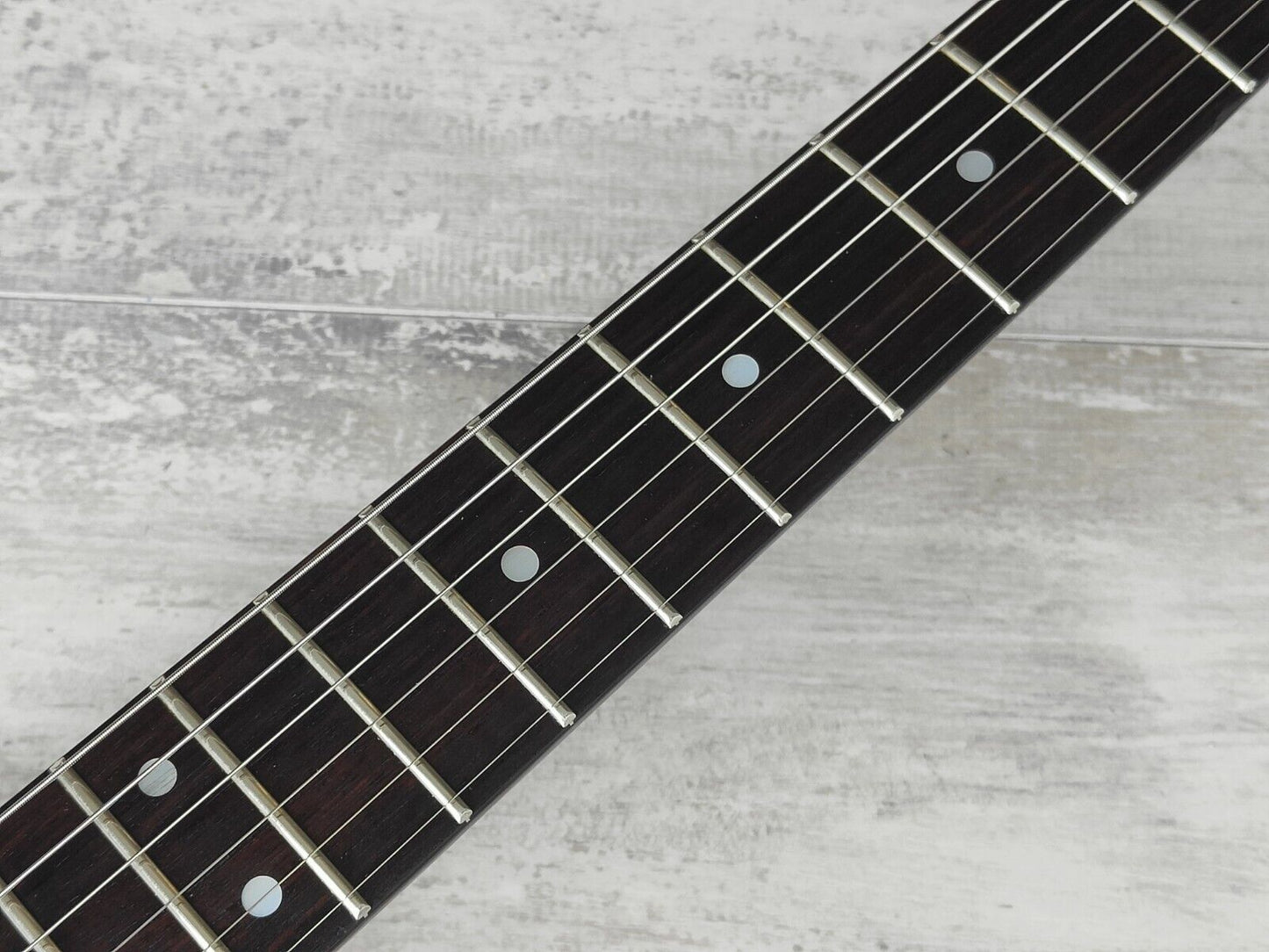 Alder body with cracked mirror segments on the top bolted to a hard maple neck with a 22 fret rosewood fingerboard, it weighs just over 4kg's. This one has seemingly be modified over the years and features a Gotoh locking tremolo system along with a Seymour Duncan 59n in the neck position and an ESP LH-200 in the bridge (wired with a three-way selector, master volume and a "straight to output" toggle.
