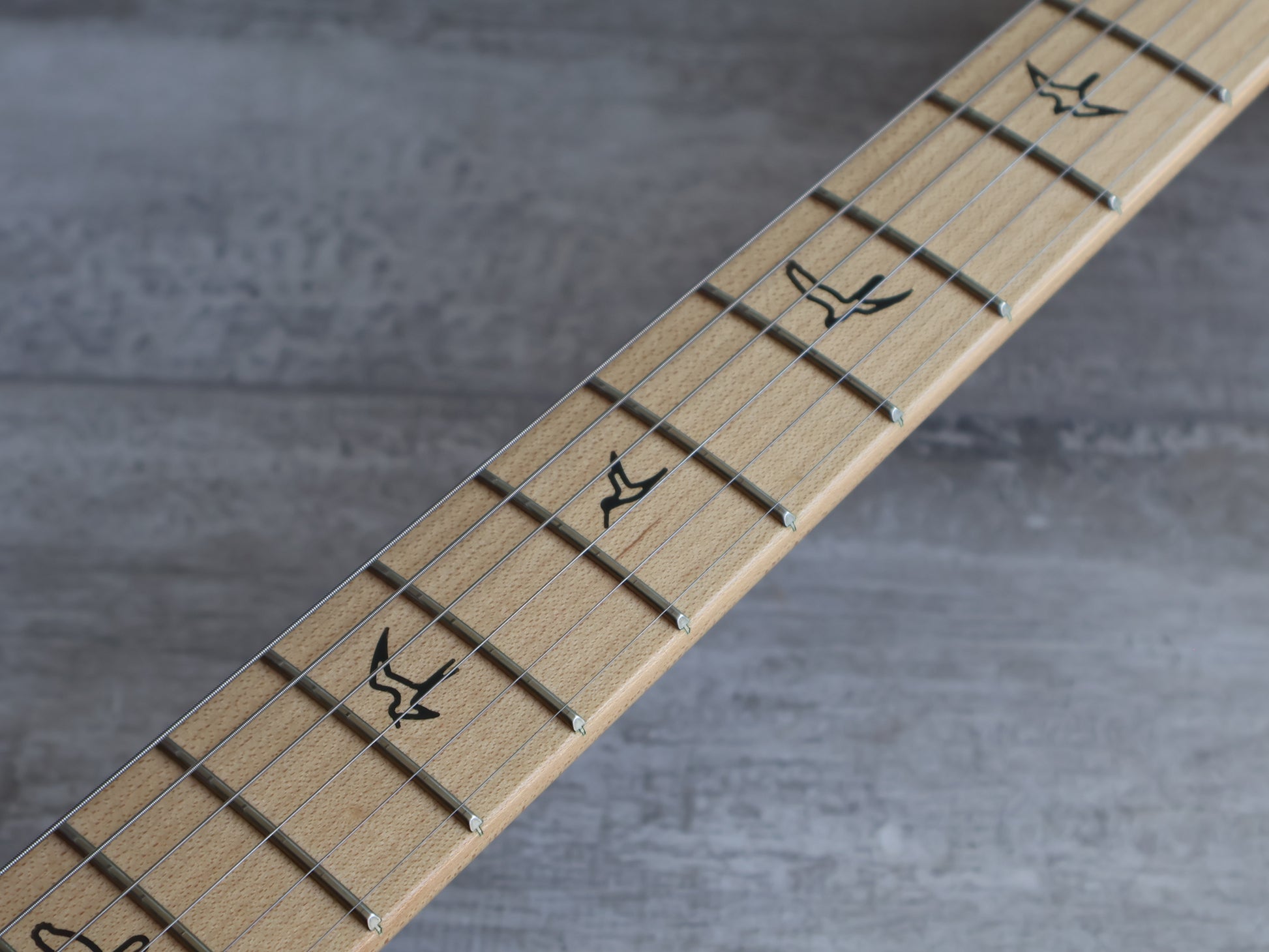 Some of the more distinctive specifications include, the headstock shape, tuners, bridge, pickups, and neck and fretboard options. The headstock shape is based on PRS’s trademark design, but inverted both to accommodate Mayer’s playing style and also to keep a consistent length of string behind the nut, which makes staying in tune easier. The tuners are a traditional vintage-style, closed-back tuner, but with PRS’s locking design. The steel tremolo takes the patented PRS design and incorporates Gen III knife-edge screws. Setup flush to the body in the neutral position so that the tremolo bridge only goes down in pitch, the bridge’s increased contact with the body allows the guitar itself to be acoustically louder, which in turn improves the signal to noise ratio of the single-coil pickups. The 635JM single-coil pickups are very round and full, with a musical high end that is never “ice-picky” or brash.