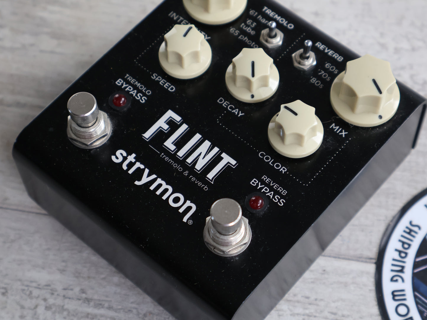 The Strymon Flint harnesses the full power of the company's formidable SHARC DSP technology to capture classic reverb and tremolo tones. Capable of operating the reverb and tremolo independently or in tandem, each effect features a three-way switch for selecting unique vintage tones ('60s, '70s, and '80s for reverb, '61 Harmonic, '63 Power Tube, and '65 Photo for tremolo) for the perfect avenue to nailing surf rock tones, putting a psychedelic edge to your sound, or crafting post-rock soundscapes.