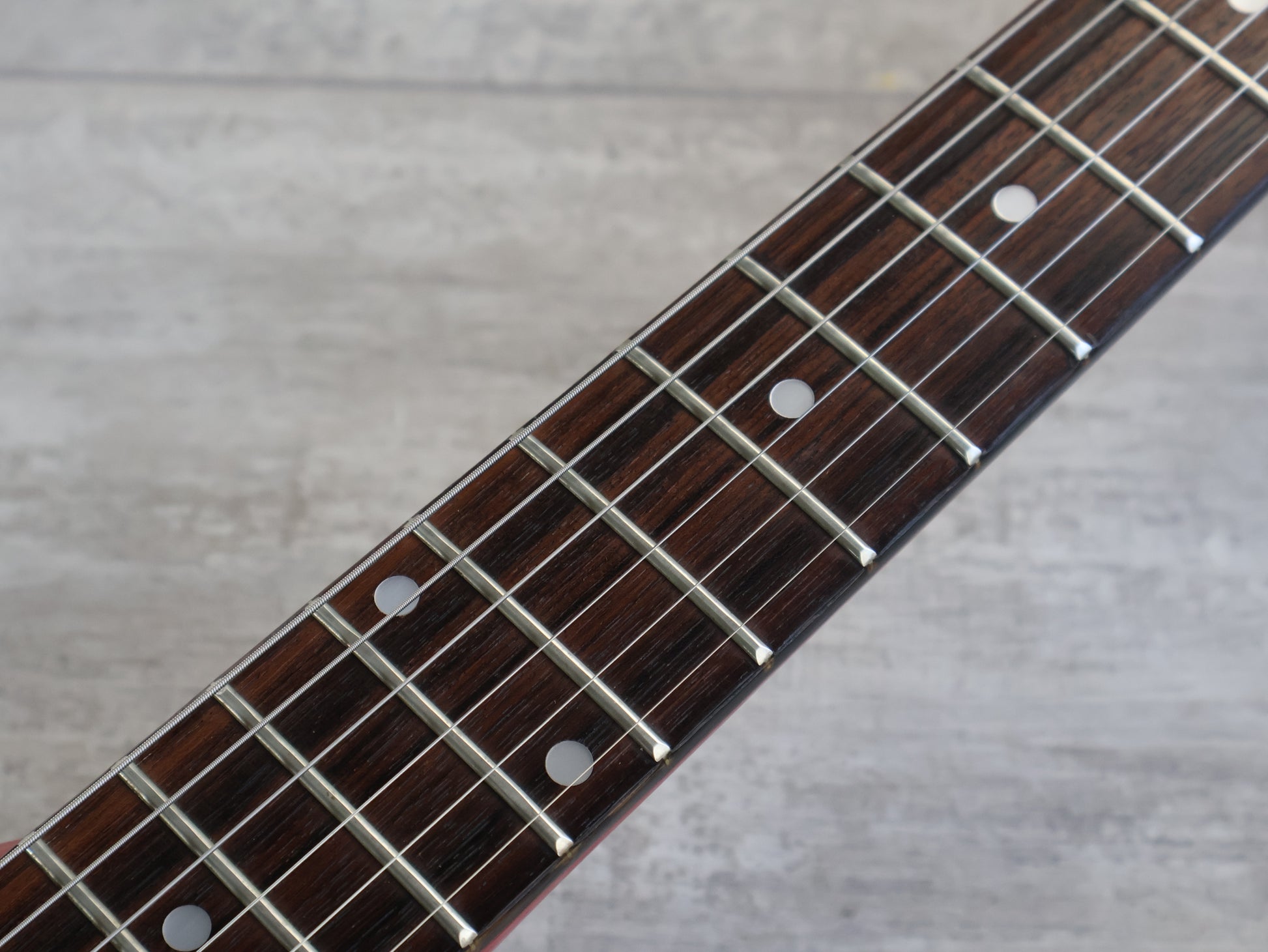 No branding anywhere and no markings inside or out, seems to be a solid neckthrough construction though and has a locking nut (unlike most). Very good overall condition with a few signs of wear and tear, restrung and plays great with plenty of life in the frets and a straight neck with an adjustable truss.